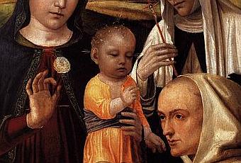 Il existe chez Bellini une autre formule avec donateur à droite, et avec l’Enfant s’éloignant vers la gauche. Il tient une fleur à l’envers, geste qui anticipe le destin tragique que sa mère pressent déjà.