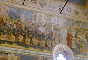 Cet étrange dédoublement s’explique par la structure d’ensemble : la fresque occupe en effet deux compartiments dans le cycle de la vie de Saint Georges, se logeant dans une interruption à la fois géographique et temporelle entre deux épisodes [0] :