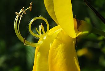 Cytisus scoparius (Genêt à balais) : arbuste à rameaux dressés ; feuilles simples ou trifoliées ; fleurs solitaires jaunes, gousses noirâtres aux marges munies de poils blancs. Plante toxique.