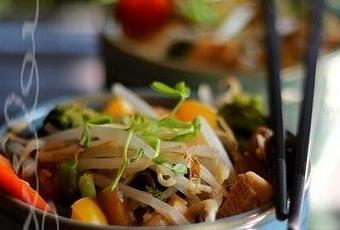 4)Ajouter les nouilles et les fèves germées sur le dessus dans la poêle sans mélanger. Remettre le couvercle et cuire un autre 5 minutes. Mélanger et servir.