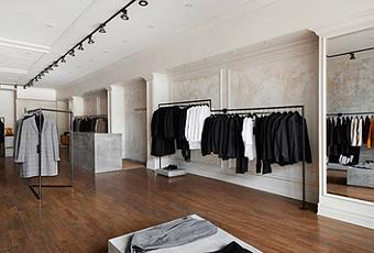 Nous avons particulièrement aimé le mélange des styles qui s’opère en douceur dans cet espace. Les murs texturés notamment, qui semblent défraîchis par le temps, se marient à merveille avec le parquet de bois sombre et patiné. A cela viennent s’ajouter des présentoirs en béton, un éclairage particulièrement soigné et moderne, ainsi que des systèmes d’accrochage de vêtement épurés et en acier.