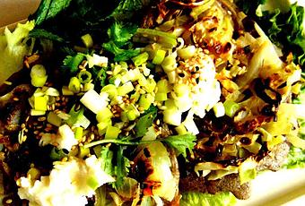 On sert avec de la mayo végane (à l'ail), des oignons verts, des graines de sésame, de la menthe, de la coriandre, éventuellement des algues.