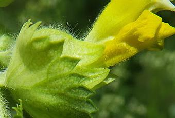 Rhinanthus alectorolophus (Rhinanthe velue) : herbacée annuelle ; feuilles opposées lancéolées dentées ; fleurs jaunes bilabiées, lèvre supérieure en casque, munie de 2 dents violettes, calice ventru et aplati latéralement ; tige et calice entièrement recouverts de poils, corolle à gorge fermée, bractées vert pâle à dents triangulaires.