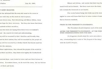 La lune est-elle de si mauvais augure ? À la lecture de cette Éventualité d’un désastre sur la Lune, il le semblerait. L’auteur de la note à l’attention du président a pour nom William Saphire. Dans un article intitulé Disaster Never Came(New York Times, 12 juillet 1999), il se remémore la naissance du plus célèbre discours qui jamais ne fut prononcé. Saphire est l’une des plumes du président. A la mi-juillet 1969, l’astronaute Franck Borman le contacte. Ancien commandant de la mission Apollo 8 en 1968, l’homme a survolé la Lune. Il est désormais officier de liaison de la NASA à la Maison Blanche. L’astronaute prévient le speechwriter : « Vous auriez intérêt à réfléchir à une alternative pour le président en cas d’incident. » Saphire avoue ne pas comprendre. Borman lâche le morceau : « Ce qu'il faut faire pour les veuves. » Il lui faut donc rédiger un discours pour le président dans l’éventualité d’une tragédie. Que dire dans l’éventualité où l’homme serait prisonnier de la Lune, ne pourrait jamais la quitter et revenir sur Terre ? Quid de la mort d’homme en un lieu extraterrestre ?