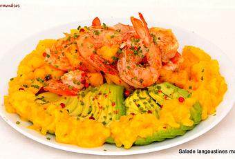 Aujourd'hui, je vous propose une salade terre/mer sucrée/salée aux saveurs exotiques de Gordon Ramsay. Comment vous décrire cette salade ?Elle est tout simplement délicieuse. Un mélange de saveurs délicat et des plus fins.Je vous la recommande vivement.Gordon Ramsay l’a réalisée avec des crevettes tigrées, moi, j’ai opté pour des langoustines.Il est important que les crustacés soient crus pour qu’ils puissent absorber toutes les saveurs de l’ail et du gingembre.D'autres recettes terre/mer sur le blog : ici.Bonnes vacances à tous ceux qui le sont et très bon weekend aux autres.