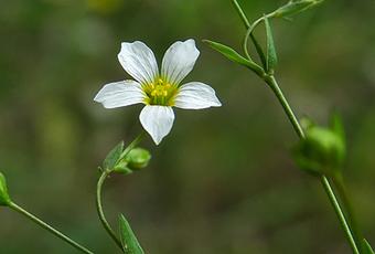 Linum catharticum (Lin purgatif) : herbacée annuelle à feuilles linéaires-lancéolées ; tiges plus ou moins retombantes ; fleurs blanches à 5 sépales, 5 pétales, 5 étamines, 5 styles.
