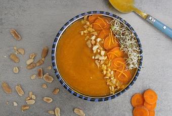Ce n'est un scoop pour personne, il fait chaud chaud chaud. Et dans ces cas-là, on a envie de manger frais et léger (en tout cas, c'est mon cas). Quoi de mieux alors qu'une petite soupe froide, qui a en plus le mérite de nous hydrater ? Certes, j'adore le gaspacho et le velouté glacé de courgette, mais cette fois-ci j'ai eu envie de changer un peu et de me tourner vers des saveurs un peu plus "charnues" avec la carotte et la cacahuète. Les esprits chagrins m’objecteront (et à raison), que ce n'est pas la saison des oranges. C'est que j'utilise ici des zestes congelés. Tout au long de l'hiver, lorsque la saison des oranges bat son plein, je prélève les zestes des oranges que je mange et je les stocke au congétaleur. Je m'en sert ensuite tout le reste de l'année pour faire des eaux aromatisées, pour parfumer mes pâtisseries, pour donner un peu de couleur à mes salades... Si vous n'avez pas comme moi des zestes d'orange plein votre congélateur, vous pouvez utiliser du zeste séché (vendu il me semble au rayon épices) ou encore ajouter 1 goutte d'huile essentielle d'orange au moment du mixage. Ou bien même vous en passez carrément, rassurez-vous, la soupe sera tout de même très bonne.