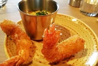 Après un sympathique amuse-bouche à base de crevettes en tempura fraiches et pimpantes, le saumon mariné et confit est d’une belle texture et bien mis en valeur par quelques légumes verts, et une émulsion de roquette et basilic qui donne un beau coup de fraicheur et d’amertume piquante, tout en finesse.