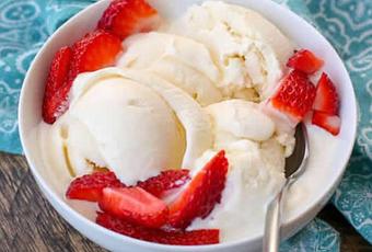 Enfin servez votre glace vanille avec des tranches de fraises pour votre dessert et bon appétit à tous.