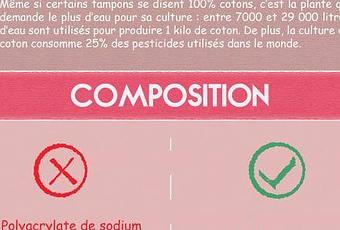 L’infographie nous rappelle que les tampons sont composés de produits chimiques tels que de la dioxine, de l’aluminium, des additifs de parfum irritants, du polyacrylate de sodium, de l’alcool, des hydrocarbures, des pesticides…