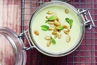 Peler le concombre et le couper en gros cubes , ajouter le yaourt, le fromage, l’huile d’olive, le pain de mie, le sel et le poivre . Placer le dans un blender mixer jusqu’à l’obtention d’une texture crémeuse. Verser dans les contenants choisis pour le service et placer au frais au moins 3 heures avant de servir. Décorer avec un peu de basilic et de menthe de l’amande.