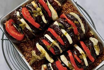 Préchauffez le four à 180 °C. Passez les aubergines sous un filet d'eau froide . Coupez dans chaque aubergine 7 fentes assez larges .Dans un plat allant au four , déposez les aubergines , arrosez d'un filet d'huile d'olive . Couvrez avec un papier d'aluminium et faites cuire 50 minutes à 1 heure pour que les aubergines soient tendres. Découpez des tranches d' halloumi et de tomates . Vous pouvez les intercaler dans les aubergines ainsi que des feuilles de basilic . Mettez une couche de petit épeautre au pesto , déposez les aubergines , un filet d'huile d'olive et remettez au four 15 minutes . A la sortie du four ajoutez un peu de pesto sur chaque aubergine .