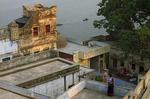 Le soleil descend tranquillement quand nous grimpons sur le toit. La vue nous laisse silencieux, contemplatif : Enlacements de terrasses, de maisons, puis le Gange.
