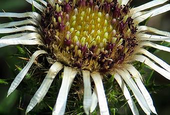 Carlina vulgaris (Carline commune) : tige dressée ramifiée ; feuilles en gouttière, embrassantes lancéolées, ondulées, épineuses ; inflorescence en capitules solitaires terminaux ; fleurs tubulaires brun-jaune, bractées extérieures foliacées, bractées intérieures coriaces blanc-jaunâtre (à ne pas les confondre avec des fleurs ligulées) ; fruits surmontés d'une aigrette soyeuse. Pelouses, éboulis fixés, friches, bords de route, ballast de voie ferrée.