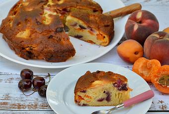 Un bon gâteau aux fruits à préparer avec les fruits de saison que l'on a sous la main (pêches, abricots, prunes, cerises, poires, framboises,...), plus il y a de fruits, meilleur c'est !