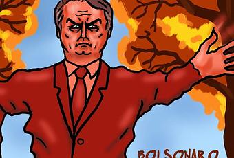 Le Président brésilien tire son pouvoir du feu. La déforestation de la forêt amazonienne (le poumon de la Terre) est selon lui un mal pour un bien. Moins de forêts - plus de cultures : voilà le contrat qu'il a signé avec Satan. L'avenir de l'humanité, compromis par une raréfaction de l'oxygène et par un accroissement du gaz carbonique dans l'atmosphère terrestre (en partie responsable de l'effet serre), ne fait pas partie du deal. Si nombre de gouvernants s'opposent à cette politique dévastatrice, il peut encore compter sur le soutien de Trump qui décrète que son homologue brésilien "fait du bon boulot !" Bref, encore une fois, qui se ressemble s'assemble !