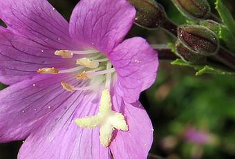 Epilobium hirsutum (Épilobe hirsute) : plante pubescente, stolonifère, à tige dressée ; feuilles oblongues opposées, sessiles, dentées, partiellement embrassantes ; inflorescence en grappe feuillée ; grandes fleurs rouge pourpre à 4 pétales bilobés, égaux, 8 étamines, style surmonté de 4 stigmates étalés en croix ; fruits munis d'une aigrette de soies. Bords des eaux, fossés humides, lieux humides.