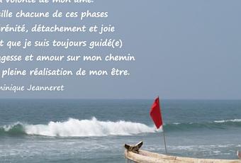 Le plan de ma vie se déroule étape par étape selon la volonté de mon âme. J'accueille chacune de ces phases avec sérénité, détachement et joie sachant que je suis toujours guidé(e) avec sagesse et amour sur mon chemin vers la pleine réalisation de mon être. - Dominique Jeanneret