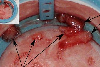 Thrombus retirés d’une artère coronaire au cours d’une intervention coronarienne percutanée dans le but de traiter un infarctus du myocarde. (flèches). (…). Source iconographique et légendaire: https://commons.wikimedia.org/wiki/File:Intracoronary_thrombus.png