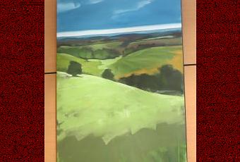 Damien Racine opère ce travail du peintre abstrait en douceur. D’un tableau à l’autre. Le glissement du réel à l’abstrait se fait imperceptiblement. D’abord, un paysage presque classique.