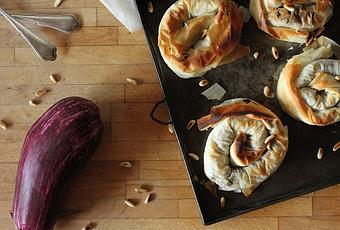 Placer une feuille de pâte filo devant vous, huiler (idéalement au pinceau) puis replier en deux dans la largeur. Déposer environ 3 c. à s. de farce à l'aubergine le long du plus grand côté, saupoudrer de pignons et enrouler le tout. Doubler d'une seconde feuille de pâte filo repliée en deux. Badigeonner d'huile d'olive et donner au rouleau la forme d'un escargot, sans serrer. Placer sur une plaque de cuisson.