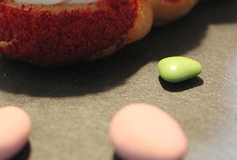 Parlons de mon éclair. Peu sucré, elle est garnie d'une ganache montée façon dragée au bon gout d'amande, d'un cœur gourmand Griottine ® et d'un craquelin pour apporter du craquant.