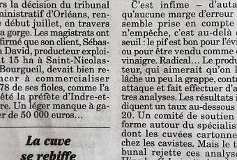 "L’analyse des échantillons par le BIEV (Bureau d’Investigation des Enquêtes Vinicoles) y aurait décelé une teneur en acidité volatile au dessus de la norme alors même que la technicienne du même laboratoire trouvait cette teneur « satisfaisante » après examen organoleptique. Sébastien procède alors à deux contre-analyses dont les résultats vont tous deux à l’encontre des résultats du BIEV et sont même en dessous de la norme européenne.