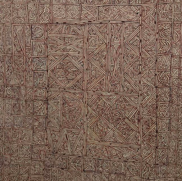 Ismael Diabaté avait été invité en 2016 pour toute la durée de cette grande foire du livre à Alger qui s’étendait sur une dizaine de jours. En arrivant à l’espace Panaf pour la première fois, alors que j’échangeais avec les organisateurs, j’observais un homme concentré et consacré à faire l’esquisse d’une toile. Derrière lui, il y avait une très belle toile avec une couleur un peu inhabituelles faisant penser à de l’encre un peu mal séché. Narriman Sadouni en me présentant à Ismael Diabaté, m’expliqua que cet artiste malien utilisait la méthode du Bogolan. Bogolan. => Premier aparté. Ayant séjourné en Côte d’Ivoire, j’ai découvert le bogolan dans ce pays. C’était un de ces tissus ressemblant pour ses motifs au pagne wax, mais sur un coton moins affiné. Les tenues, les nappes en bogolan avaient bonne presse et elles étaient très demandées à Abidjan dans les années 90… Ce que j’ignorais, c’était la manière avec laquelle ces bogolans étaient produits artisanalement. Fin du premier aparté. <=Ismael Diabaté m’explique la pratique du Bogolan. Fait avec la terre. Cette technique de production s’appuie sur des produits naturels : terre, « le liquide révélateur », tissu en coton. La technique est ancestrale au Mali. Elle est historiquement faite par des femmes. Les motifs déposés sur ces Bogolans sont des exutoires pour ces femmes qui racontent leurs histoires, leurs quotidiens. Le code a un sens. Et ce n’est pas un hasard si on retrouve sur les pagnes Wax des motifs chargés de défis, de battles, d’histoire d’amour, de rivalité, de naissances… La pratique aurait été reprise à partir des usages et des représentations par les femmes maliennes sur le Bogolan.