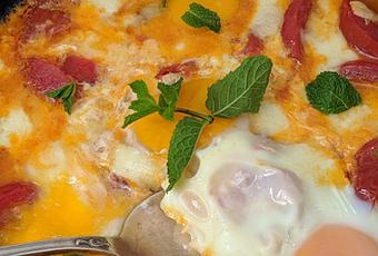 Le beau temps et la chaleur sont revenus nous donnant l’impression d’être de nouveau en été.Alors, qui dit beau temps, dit recette estivale.Cette recette de Jamie Oliver est très simple à réaliser et en un temps très bref. C'est la version italienne de la tomate confite aux oeufs et fromage qu'on trouve sur le tout le pourtour du bassin méditerranéen.Je n'avais de basilic, alors je l'ai remplacé par de la menthe.La mozzarella , peut être à cause de son contact avec le jus de tomates ne fond pas autant qu'elle le devrait.J'ai accompagné ce plat de tranches de pain maisonCe plat est délicieux. D'autres recettes de tomates aux oeufs : ici