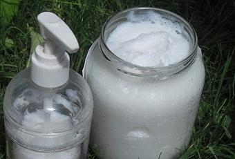 Une fois que le mélange a épaissi, mélanger avec un batteur électrique pour obtenir une texture lisse et très onctueuse, puis verser le savon dans un récipient pour le stocker.