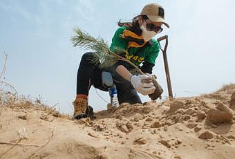 Une stratégie pour atténuer les effets du changement climatique : depuis 2001, la marque a déjà planté plus de 10 millions d'arbres dans le monde (ci contre : plantation de 2 millions d'arbres dans le désert d'Horqin, en chine, en 2015).