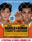 Il y a deux ans, suite à une fringale due à une inhalation massive de fumées illicites, Harold Lee et Kumar Patel se mettaient en route pour White Castle, le plus prodigieux fast food du monde. Un milliard de mésaventures plus tard, ils parvenaient enfin à entrer dans le nirvana du burger, non sans l’aide de Neil Patrick Harris, qui avait pourtant commencé par leur voler leur voiture. Sortant en salles alors que le film précédent (Harold & Kumar chassent le burger) n’avait pas eu cette chance, Harold & Kumar s’évadent de Guantanamo reprend exactement dix minutes après la fin de celui-ci, les deux anti-héros projetant cette fois de partir à Amsterdam pour rejoindre la fille dont Harold est amoureux. Un rêve de courte durée puisqu’un quiproquo les mènera tout droit dans l’enfer de Guantanamo. On l’aura compris, le film de Jon Hurwitz et Hayden Schlossberg (déjà scénaristes du premier volet) est une comédie complètement idiote, poursuivant sur la voie des monuments régressifs que sont Dumb and dumber et Eh mec ! elle est où ma caisse. Sans jamais atteindre les sommets fixés par ces deux brillantes références, Harold & Kumar…est cependant un très bon produit de substitution, qui procurera aux amateurs leur dose vitale d’humour con.S’il vaut mieux avoir vu le premier épisode pour prendre plus de plaisir à renouer avec les personnages, tout le monde peut évidemment entrer dans le film sans peine, l’intrigue n’étant pas l’élément clé du genre. Elle est cependant assez bien construite, l’évasion de Harold et Kumar donnant lieu à un road movie à travers les Etats-Unis, l’occasion pour les auteurs de dépeindre avec délectation la frange la plus raciste du pays. Pas sûr que leur description soit si excessive que ça… En tout cas, elle donne lieu à un paquet de gags sur la discrimination (les héros étant respectivement d’origine coréenne et indienne) aussi bien sentis qu’hilarants. Quand à nos deux compères, ils enchaînent les aventures et les rencontres avec une frénésie assez réjouissante, même si l’inspiration des auteurs est très variable. Parmi les grands moments du film : une soirée « chatte à l’air », une partie à trois avec un sachet d’herbe géant, et une rencontre inopinée avec un jeune cyclope. Tout est dit : Harold & Kumar s’évadent de Guantanamo, c’est du n’importe quoi pur sucre, de l’humour bas de plafond, des zizis et des foufounes à tout va. Bon appétit.