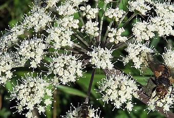 Angelica sylvestris (Angélique sauvage) : plante robuste ; tige rougeâtre creuse ; feuilles gainées, composées, à folioles arrondies, dentées et asymétriques ; fleurs groupées en grandes ombelles hémisphériques à 20-30 rayons velus, involucre généralement absente, involucelles à bractées allongées, pétales mucronés blancs à rosés, fruit à quatre grandes ailes. Prairies humides, bas-marais, fossés, berges de cours d'eau.