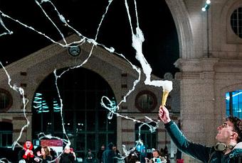 Une œuvre nomade de Vivien RoubaudSucre cristal n°3, écoulement laminaire, courant alternatif, atmosphère modifiée. Œuvre nomade de la collection du Grand Paris Express. Une usine à barbe à papa mobile répand aléatoirement dans les airs un mélimélo de filaments blancs. Les passants sont invités à les déguster mais surtout à admirer ces formes fugitives et serpentines évoquant du coton, des nuages ou des courants électriques libérés de leurs circuits. L'artiste est un professionnel du détournement des fonctions utilitaires des machines - pour concevoir cette plateforme sucrière, il s'est emparé de sableuses et de fours centrifuges et en exploite les propriétés cachées. Avec cette installation à la fois festive et expérimentale, Vivien Roubaud revisite ici un élément symbolique de la fête foraine et fait écho à l'univers des chantiers engagés pour la construction du Grand Paris.