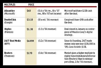 Une chose est certaine, comme je me le demandais dans "Would you have Google as your middleman", Microsoft avait une reponse prete au mouvement du titan de l'Internet. Triste nouvelle pour les agences de pub en ligne, la concurrence et le champ de bataille a change dans votre monde en quelques semaines (voir le tableau). Lisez cet article de AdvertisingAge Microsoft Storms Madison Avenue pour en savoir plus sur ce tremblement de terre.