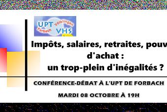 C’est pourquoi, il m'a semblé indispensable de proposer une conférence grand public à l’Université Populaire Transfrontalière (UPT) de Forbach, le mardi 8 octobre à 19h, avec pour titre Impôts, salaires, retraites, pouvoir d'achat : un trop-plein d'inégalités ?. L’entrée est fixée à 5€.