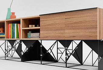 La collection Z a été imaginée pour la marque Odesd2, se compose de module à associer. Une partie haute en bois, caisson, tiroir, ou ouverture permettant de proposer le rangement adapté. La partie, basse, en métal, est composée de son piètement en métal noir jouant avec les formes. Chaque association de module va permettre de construire une forme, une déclinaison du dessins de piètement, entre pleins et vides.