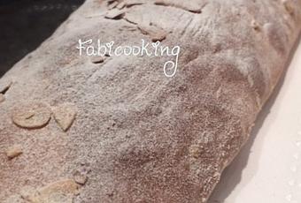 - A la fin, placer un papier cuisson sur une plaque à pâtisserie et rouler le boudin dessus avec le côté de la soudure vers le bas. Veillez à ce que la partie avec la chapelure et la cannelle se trouve bien placée vers le bas car elle va avoir pour rôle d'absorber le jus des pommes durant la cuisson.