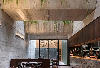 Le restaurant de 300 mètres carrés comprend un espace d’accueil, une salle à manger de 25 couverts, une cuisine ouverte, un petit bar, une cave à vin, un petit jardin sur son toit. La végétation luxuriante déborde des grandes poutres de béton, tandis que la lumière naturelle pénètre dans l’espace à partir de puits de lumière percés au plafond. Pour compléter le béton, l’équipe a choisi comme matériaux le bois et la pierre qui évoquent des textures naturelles.
