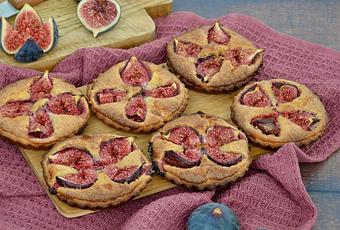 Foncer les moules à tarte avec la pâte. Garnir chaque moule avec 1,5 cuillère à soupe de crème d'amande. Ajouter une figue ouverte en 4 au centre de chaque moule en l'enfonçant légèrement dans la crème.
