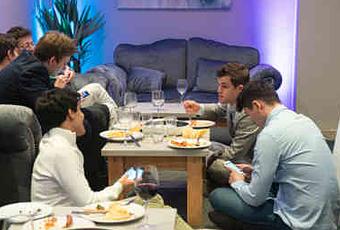 Le champion du monde d'échecs Magnus Carlsen en discussion avec ses collègues grands maîtres lors de la cérémonie d'ouverture du tournoi Ile de Man - Photo © Maria Emelianova pour le site Chess.com