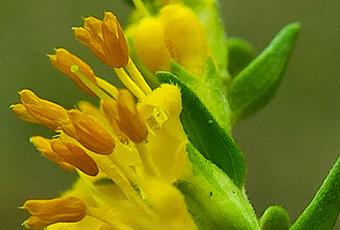 Odontites luteus (Odontite jaune) : herbacée annuelle hémiparasite sur racines de graminées ; petites fleurs en épi unilatéral, corolle bilabiée, jaune bien ouverte lèvre supérieure en casque, lèvre inférieure trilobée. Pelouses, friches, prairies sèches