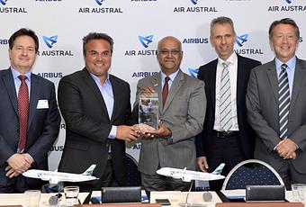Toulouse, 14 octobre 2019 - Air Austral, compagnie française basée sur l'île de la Réunion, a signé une commande ferme portant sur trois A220, le tout nouveau membre de la famille Airbus. Cette commande fait d'Air Austral le premier client de l'A220 dans la région de l'Océan Indien. Grâce à leur réduction de 20 pour cent de la consommation de carburant et des émissions de CO2, les A220 permettront à Air Austral de réduire ses coûts et son empreinte carbone sur ses lignes internationales dans la région.