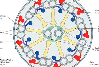Ensemble des gènes en cause dans la dyskinésie ciliaire primitiveCette figure montre l’axonème et résume et présente les gènes (plus de 40 en tout) qui sont associés à la dyskiinésie cliliaire primitive en affectant les protéines ciliaires, leur transport, ou l’ancrage de leur structure. ODA=bras de dynéine externe. CP=paire centrale de microtubules ou microtubules uniques. N-DRC=complexe de régulation nexine-dynéine. PCD=dyskinésie ciliaire primaire.