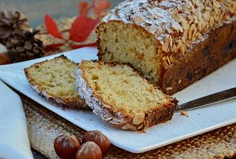 Un délicieux cake bien moelleux et très riche en noisette : huile de noisette, poudre de noisettes, pralin et noisettes effilées.