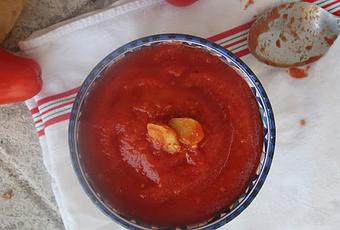 Mixer avec un filet d'huile d'olive. Passer au chinois si désiré (cela peut être utile si vous n'avez pas pelé les tomates).