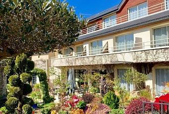 On peut aussi entrer dans cette imposante auberge de la petite ville de Sainte-Anne d’Auray par une porte dérobée à l’arrière de la maison en quittant le parking. Porche en pierres taillées, et l’on découvre un jardin (presque) extraordinaire. Un festival de plantes et de fleurs cultivées avec soin et passion par le propriétaire Monsieur Larvoir. Une de ses passions avec la cuisine et l’hôtellerie.