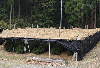 Plantation shizen-shitate à Uji-Shirakaza, cépage Uji-hikariVoici donc venir cette année encore les cépages Samidori, Asahi, Uji-hkari, et Gokô de M. Tsuji. Il s'agit bien sûr de matcha faits à partir de tencha cultivés en plantation non-taillée shizenshitate. Bien évidemment, avec ce type de plantation l'ombrage direct et la récolte mécanique sont impossibles. Les théiers étant coupés très bas après la récolte, on ne peut pas non plus utiliser ces plantations pour des deuxièmes récoltes.