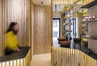 Derrière ce parement de bambou, les architectes ont eu la bonne idée d’installer un doux rétro éclairage qui permet de souligner la seconde peau de la boutique. Pour renforcer cet environnement naturel, de grandes plantes sont disséminées dans leurs pots de terre cuite.