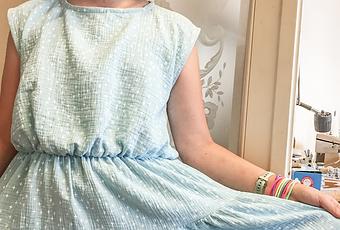 Ma filleule a adoré la robe de sa cousine et son anniversaire approchait... J'ai choisi la version courte qui va bien aux minis, sans retouche. Coupée dans le plus petite taille. J'ai du ajuster un peu l'encolure pour ma filleule qui est toute fine. Rien de bien difficile.
